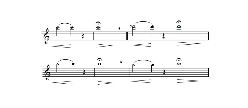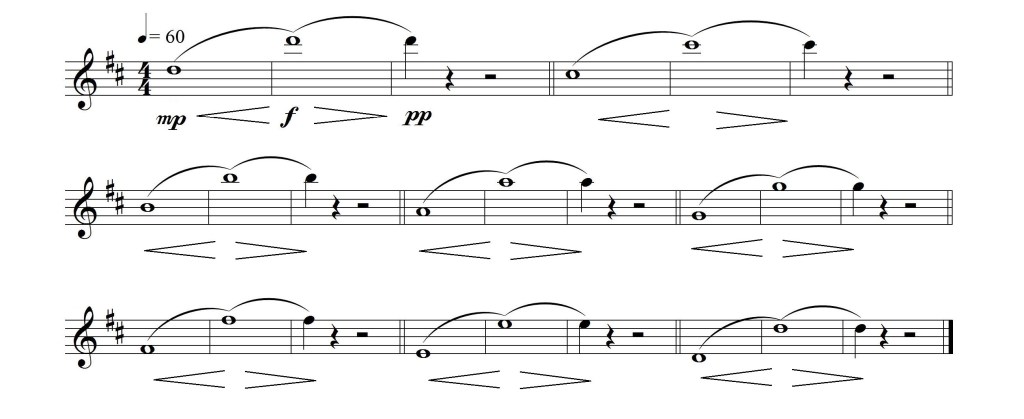 - Après le crescendo et avant de commencer le diminuendo, nous coupons la note, respirons de façon détendue et attaquons à nouveau la note juste au point où nous l’avons laissée, à la fois en hauteur et en intensité. Cela nous oblige à mémoriser comment nous avons eu le placement de l’ensemble de l’appareil d’émission, du diaphragme à l’embouchure, et à savoir comment le reproduire après une pause.