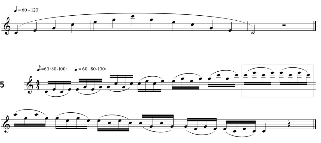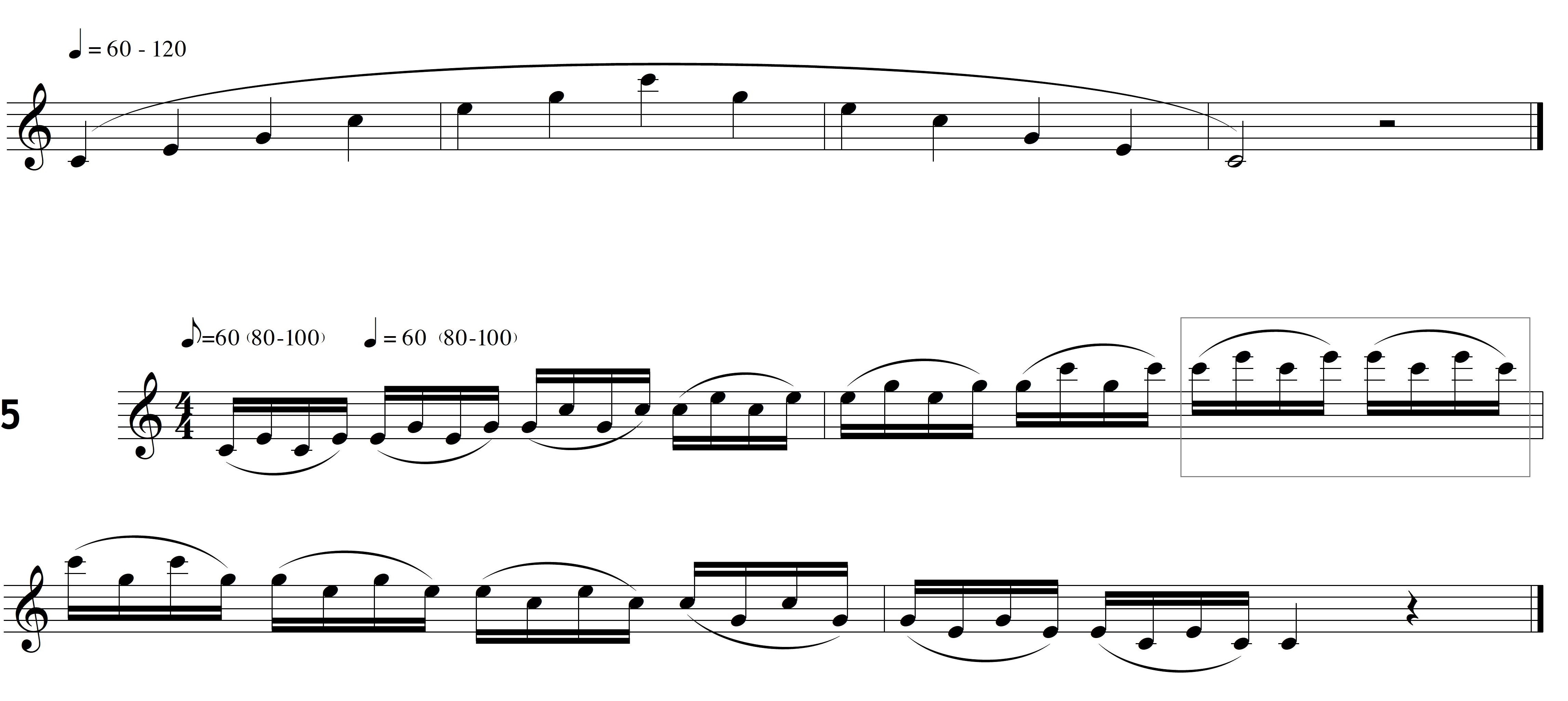 En el caso de los arpegios se proponen dos velocidades diferentes, una para utilizarlos como ejercicio de sonido y la otra como preparación al trabajo de flexibilidad del ejercicio número cinco. En ambos casos debe buscarse la limpieza de la ligadura, sin golpear el sonido en los cambios de nota.