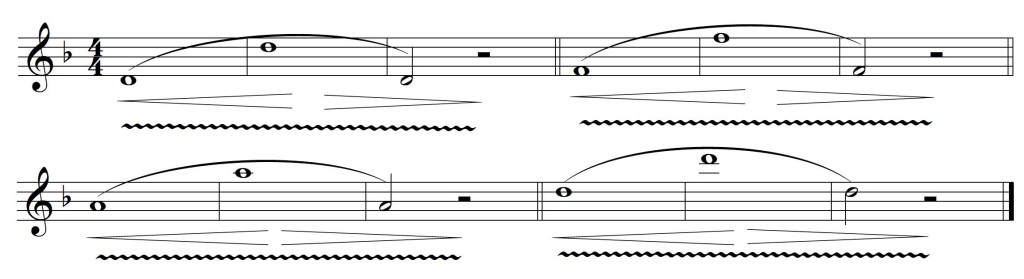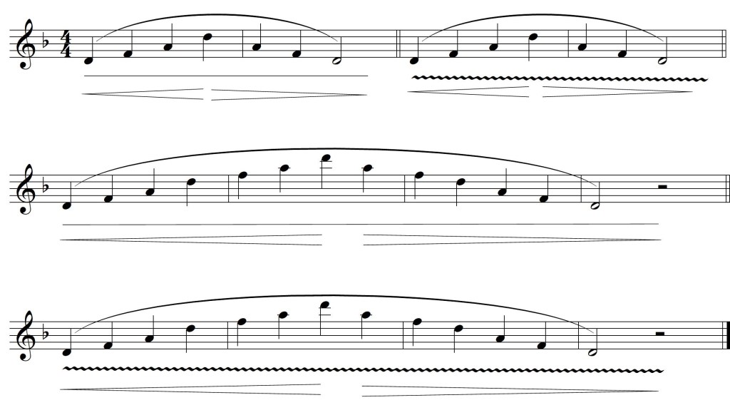 - Exercice 8.- Nous allons répéter l’exercice 5, mais cette fois avec un mouvement crescendo-diminuendo contrôlé qui nous permet de vérifier que le vibrato n’interfère pas avec le phrasé des notes.
