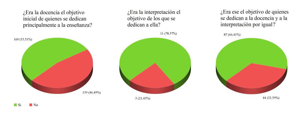 La primera cuestión sobre la que se pretendía reflexionar era cuál había sido el objetivo que estos profesionales se habían marcado durante su etapa de estudiante. Poco más de la mitad de quienes se dedican principalmente a enseñar declara que ése era su propósito inicial, porcentaje que —en este caso referido a la actuación— aumenta hasta casi un ochenta por ciento entre quienes se consideran como intérpretes. Por último, dos tercios de las personas que se dedican por igual a las dos actividades declaran que eso era precisamente lo que deseaban desde un principio.