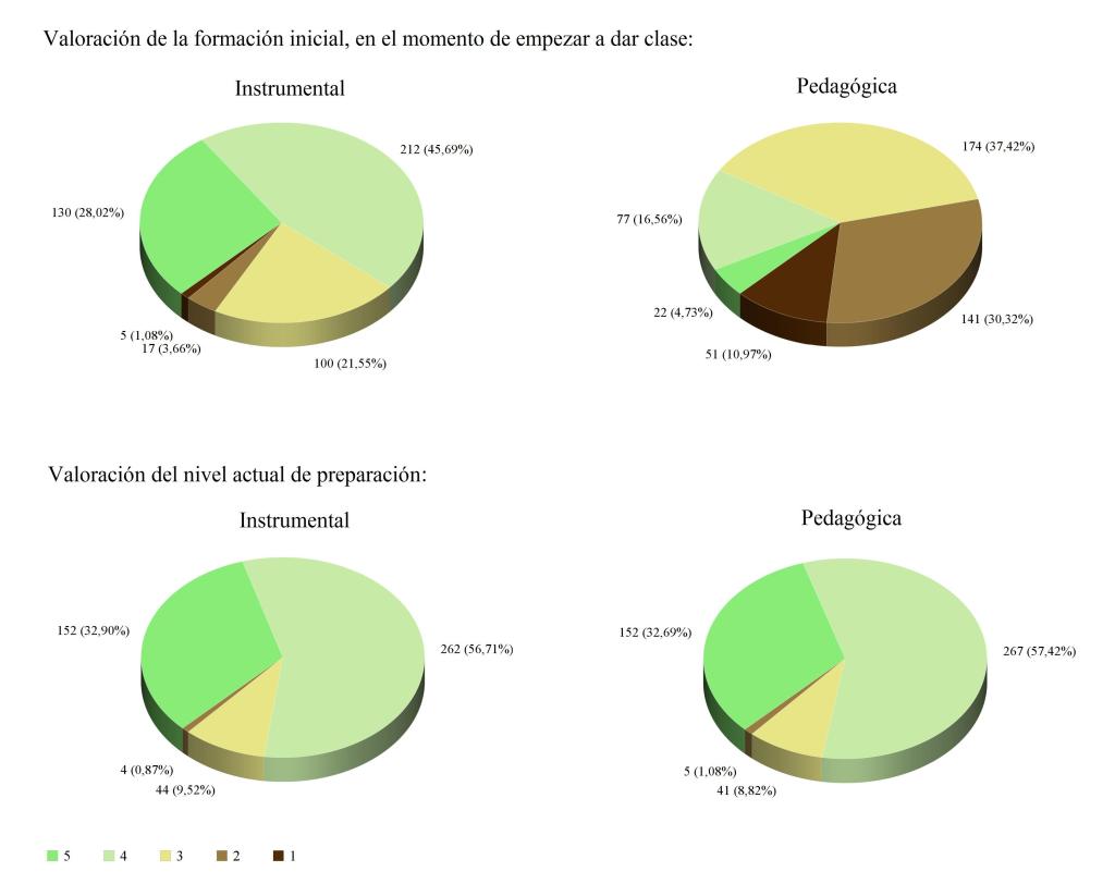 Al ser preguntados por cómo valoran su formación inicial tanto en el campo instrumental como en el pedagógico y si aquella fue la más adecuada para su trabajo actual se observa claramente que existe una gran desigualdad entre ambas. Pero lo más importante es el contraste que esos datos ofrecen comparados con los obtenidos al preguntar sobre la percepción que tienen acerca de su preparación instrumental y pedagógica en el momento actual, que ofrecen una gráfica prácticamente idéntica en los dos casos.
