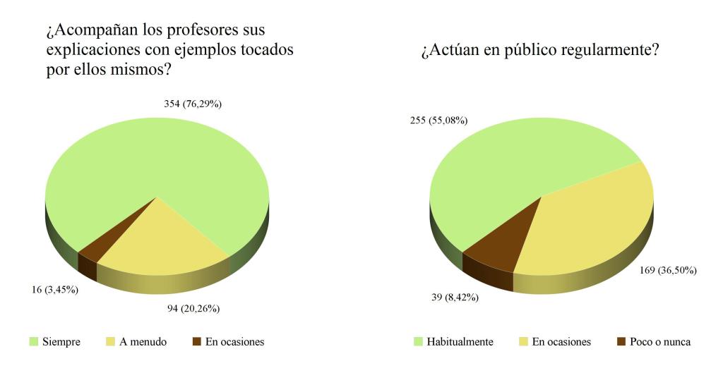 Otros aspectos importantes que la encuesta pretendía investigar para conocer la relación que los profesores tienen con su instrumento eran en qué medida utilizan ejemplos tocados por ellos mismos como complemento a sus explicaciones en clase, si además de enseñar actúan con frecuencia en público y si los propios centros ofrecen las suficientes oportunidades de hacerlo.