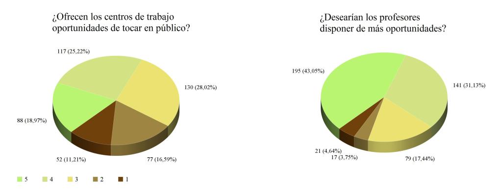 En los gráficos anteriores se puede ver que prácticamente la totalidad del profesorado utiliza habitualmente su instrumento para facilitar sus explicaciones, aunque las ocasiones en que actúan en público no se muestran en la misma proporción, lo que parece indicar que el hecho de actuar o no hacerlo no es una decisión voluntaria, sino que viene condicionada por otros factores. Para comprobar si los propios centros facilitan esas actuaciones se les pidió que puntuaran del uno al cinco las ocasiones que los centros les ofrecían, y también en qué medida desearían disponer de más oportunidades.