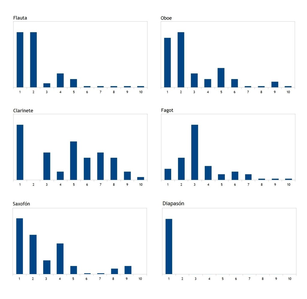 Plus important encore est le fait que toutes les harmoniques de la série ne sont pas présentes à la même intensité. La raison du timbre distinctif et de la couleur caractéristique du son des instruments réside précisément dans l’intensité différente avec laquelle chaque harmonique sonne dans chacun d’eux. En effet, les différentes parties de l’instrument et les matériaux avec lesquels ils sont construits ont leur propre capacité de vibration, et la combinaison de toutes ces différentes vibrations est ce qui donne à l’instrument sa gamme différenciée d’harmoniques. Si l’un de ces éléments variait, le son changerait également. Si l’on compare le spectre harmonique de divers instruments —dans lequel les harmoniques de chacun sont représentés avec leur intensité respective— il est facile de voir la différence entre eux:
