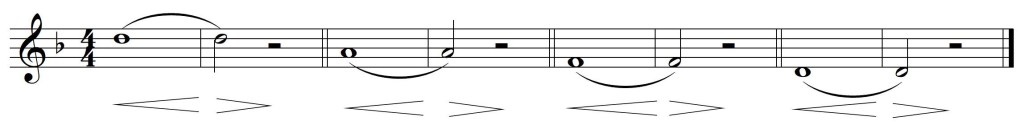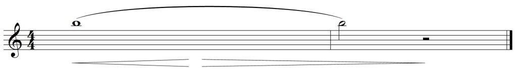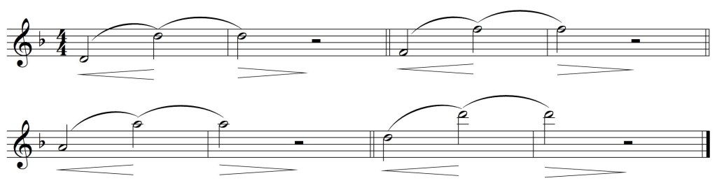 2.- Nous jouons la même note que dans l’exercice précédent, mais dans ce cas avec un crescendo-diminuendo, augmentant et relâchant progressivement le support dans le diaphragme. Il faut corriger doucement l’ouverture de l’embouchure pour compenser le différent flux d’air, mais il ne faut pas penser que c’est ce mouvement qui produit le changement de dynamique. Il faut veiller à ce que dans cet exercice seule l’intensité du son varie, pas sa justesse.