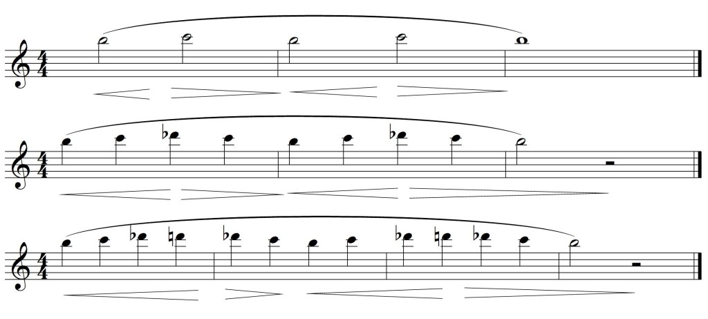 6.- Sur chacune des notes de l’exercice précédent, un mouvement crescendo-diminuendo, pour ressentir la variation du support dans le diaphragme qui permet le changement de dynamique et le mouvement de l’embouchure qui le compense pour ne pas influencer la justesse , comme dans l’exercice numéro 2.